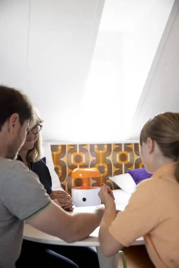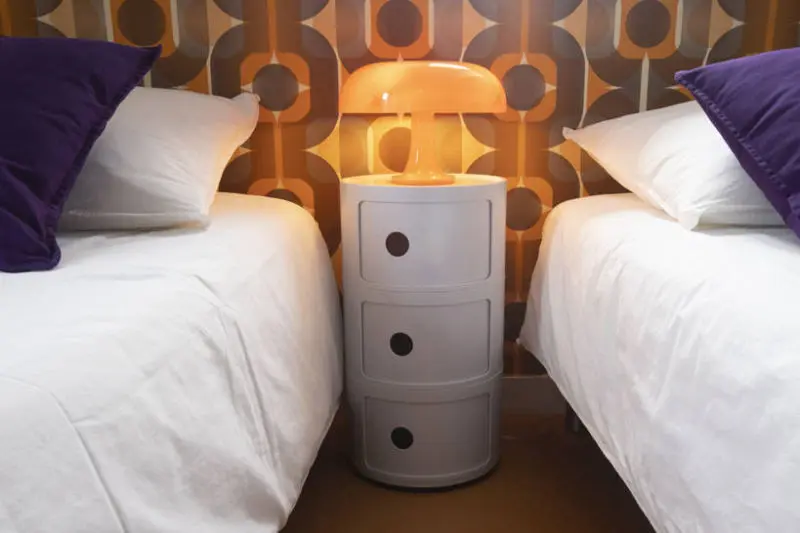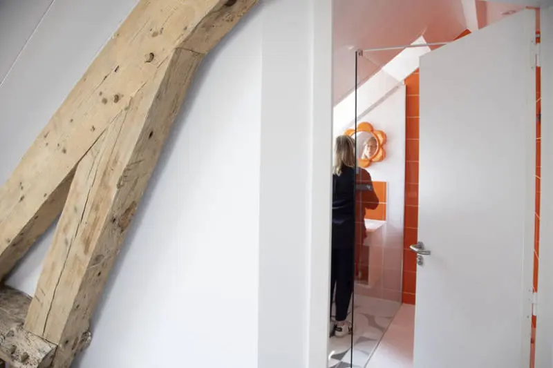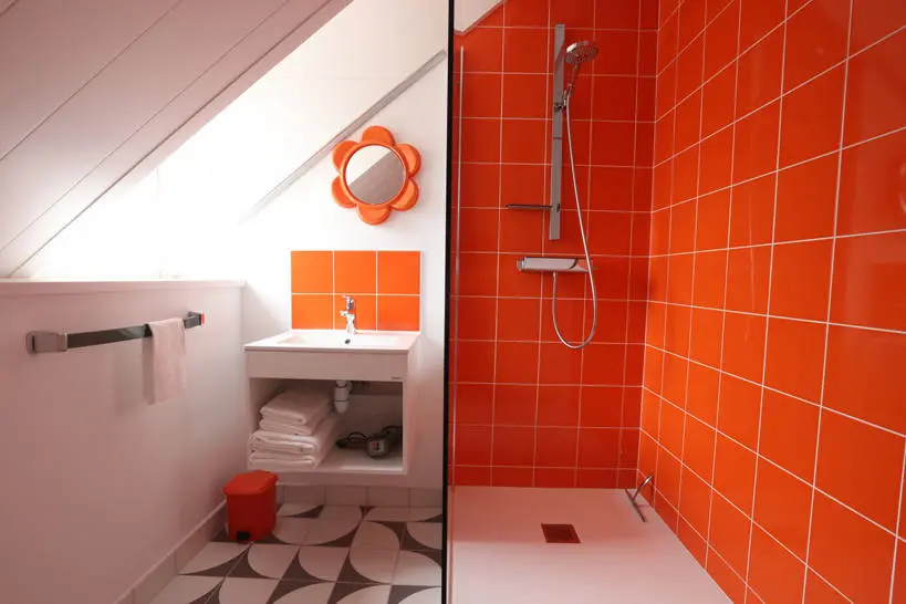 L'orange du papier peint (emblématique des années 70) s’accorde avec la gravure « Panam Building » de Pol Bury (auteur de la fontaine du Palais Royal près des colonnes de Buren).
